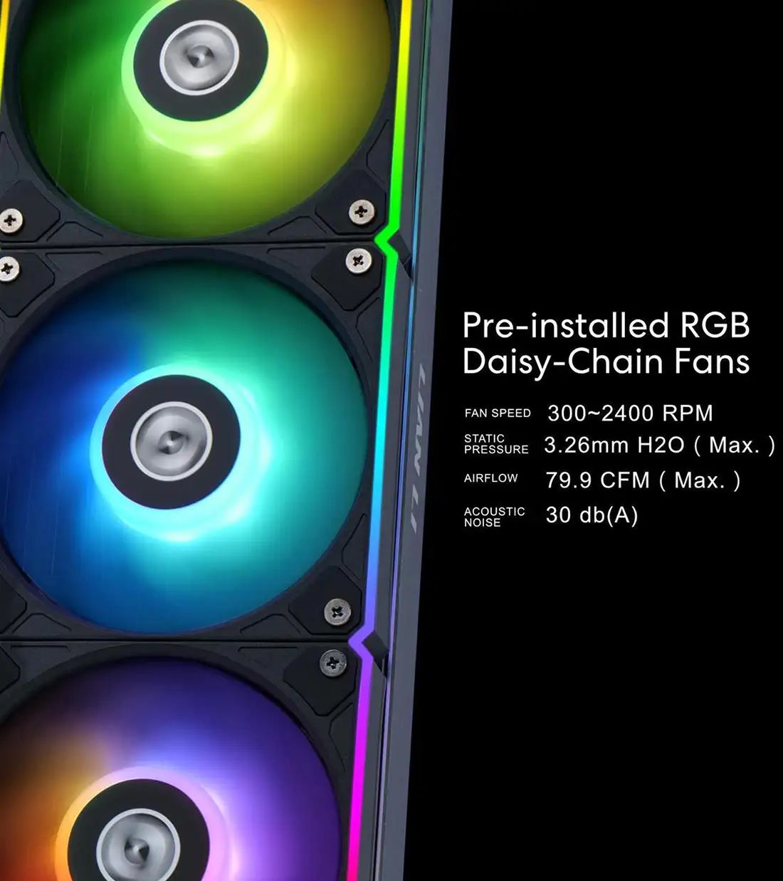 برای دفع حرارت از رادیاتور، HydroShift LCD 360R Black از سه عدد فن 120 میلیمتری با ابعاد 28×120×124 میلیمتر بهره میبرد. این فنها با نوع بلبرینگ FDB Bearing، عملکردی روان، کمصدا و با طول عمر بالا ارائه میدهند. سرعت گردش این فنها در بازه 300 تا 2400 دور بر دقیقه قابل تنظیم است و میتوانند به حداکثر جریان هوای 79.9CFMو حداکثر فشار هوای 3.26mmH2Oدست یابند که نشان از قدرت خنککنندگی بالای آنها دارد. علاوه بر عملکرد فوقالعاده، این فنها دارای نورپردازی ARGB نیز هستند که امکان ایجاد جلوههای نوری زیبا و هماهنگ با سایر قطعات سیستم را فراهم میکند.
