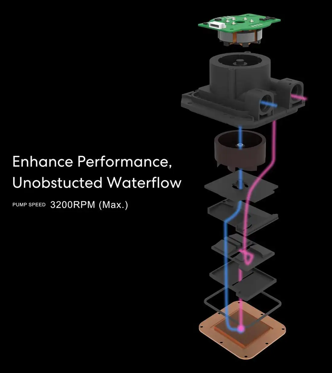 برای گردش مؤثر مایع خنککننده در سراسر سیستم، HydroShift LCD 360R Black از یک پمپ قدرتمند با حداکثر سرعت 3200 دور بر دقیقه بهره میبرد. این پمپ، جریان مایع پایدار و سریعی را تضمین میکند و به انتقال حرارت به طور مؤثر کمک میکند. علیرغم قدرت بالا، سطح نویز این خنککننده در حداکثر عملکرد نیز تنها 30 دسی بل است که نشان از طراحی کمصدای آن دارد.