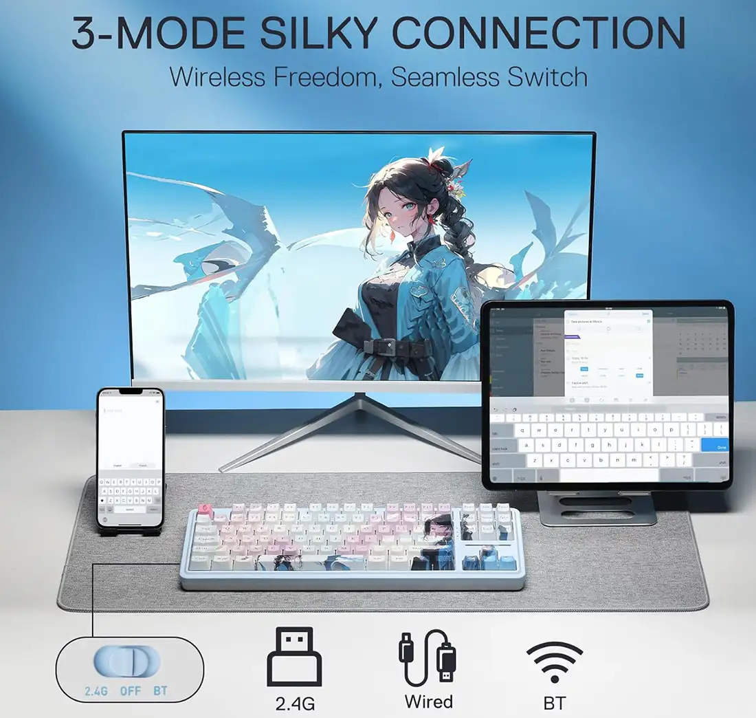 کیبورد مکانیکال گیمینگ بیسیم ردراگون Antonium K728 PRO AK ترکیبی خیرهکننده از عملکرد مکانیکال، آزادی بیسیم و زیبایی بصری الهامگرفته از انیمه است. این کیبورد با طراحی فشرده 87 کلیدی (TKL) فاقد کلیدهای نام-پد است و فضای بیشتری برای مانور ماوس در اختیار شما قرار میدهد. برجستهترین ویژگی آن، قابلیت اتصال سهگانه (Tri-Mode) است: شما میتوانید از طریق اتصال باسیم (پورت USB)، دانگل USB 2.4 گیگاهرتز برای گیمینگ بیتأخیر، و بلوتوث برای اتصال چند دستگاهی، استفاده کنید. رنگ جذاب آبی روشن با طرح خاص انیمه، ظاهری کاملاً متمایز و هنری به ستاپ گیمینگ شما میبخشد. نوع کیبورد، مکانیکال بوده و قابلیت Anti-Ghosting کامل (تمامی کلیدها)، ثبت دقیق هر ضربه کلید را در حساسترین لحظات بازی تضمین میکند. نورپردازی RGB کامل نیز جلوهای پویا و قابل تنظیم به محیط بازی شما میبخشد.