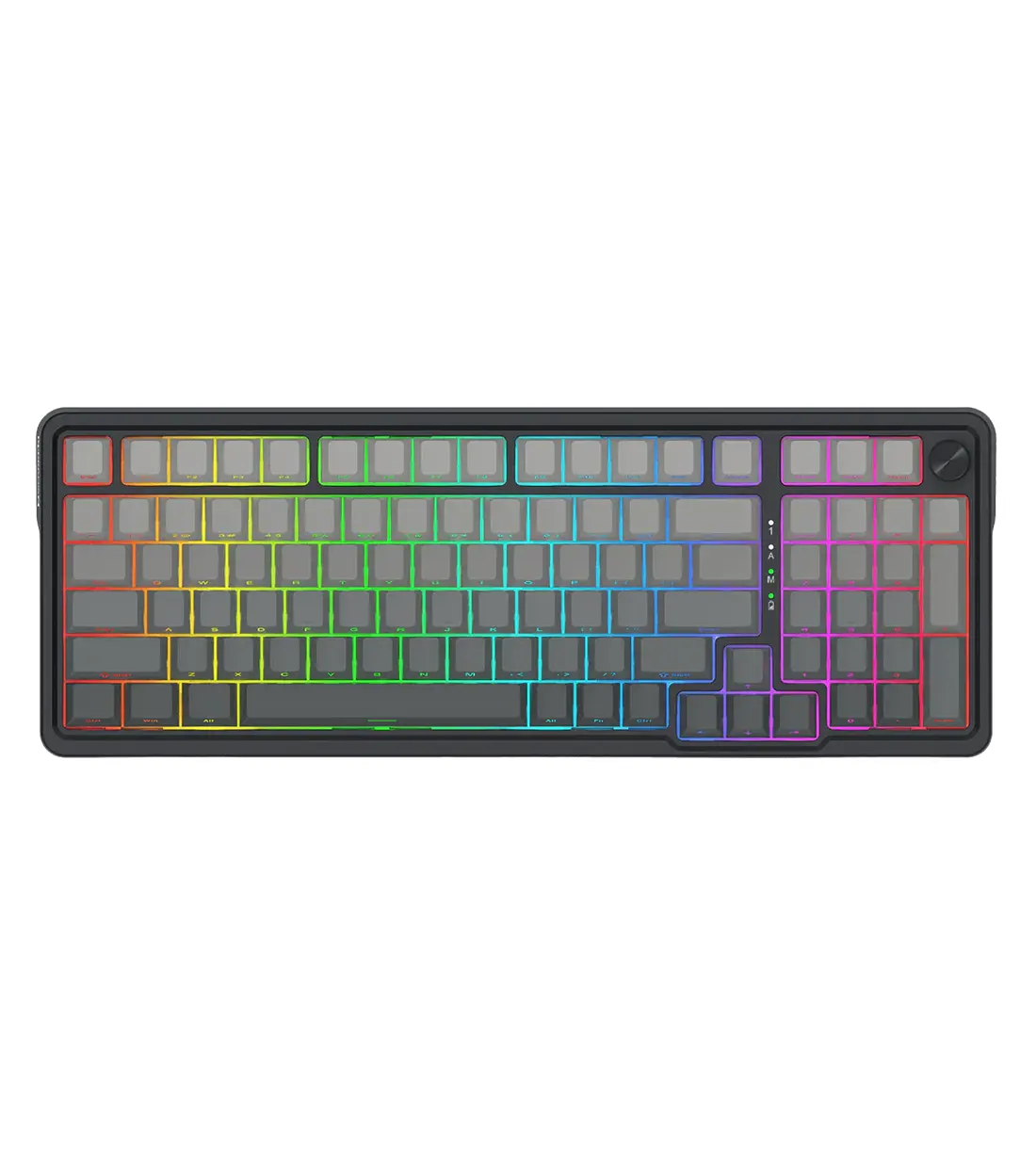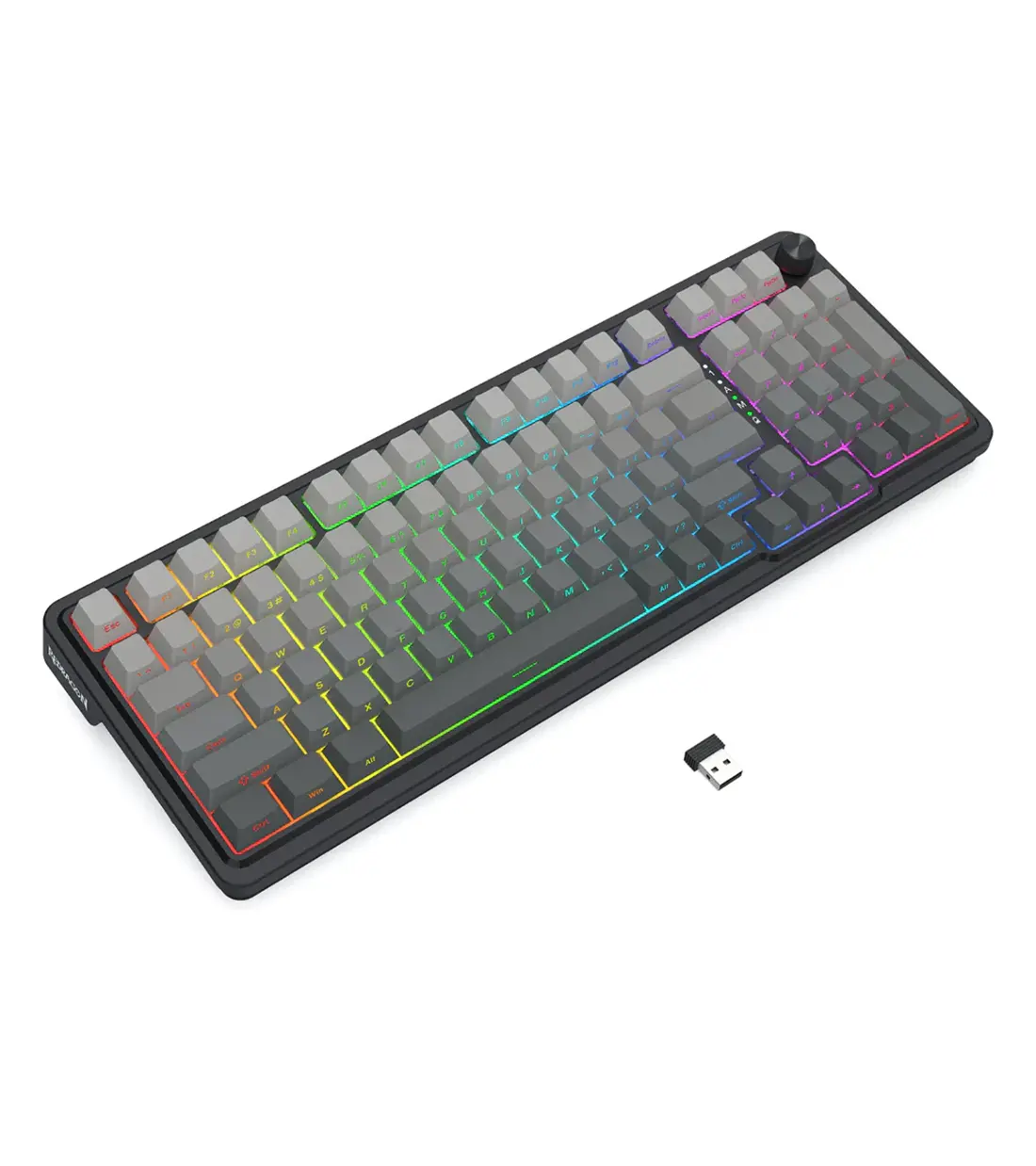 زیبایی بصری کیبورد EISA K686 SP PRO به اندازه عملکردش خیرهکننده است. با نورپردازی RGB کاملاً قابل تنظیم، شما میتوانید از میان میلیونها رنگ و دهها افکت نوری، جلوه مورد علاقه خود را انتخاب کنید تا با ستاپ گیمینگ شما هماهنگ شود. این نورپردازیها نه تنها جنبه زیبایی دارند، بلکه در محیطهای کمنور نیز دید کلیدها را بهبود میبخشند. علاوه بر این، این کیبورد مجهز به یک رُل کنترل صدا (Dedicated Control Knob) است. این ولوم چرخشی اختصاصی، دسترسی سریع و آسان به تنظیمات صدا و نورپردازی را فراهم میکند؛ کافی است بچرخانید تا صدا کم و زیاد شود یا آن را فشار دهید تا نورپردازی را تغییر دهید. این کلید چندکاره، تمرکز شما را در حین بازی حفظ میکند و نیاز به فشردن کلیدهای ترکیبی را از بین میبرد.