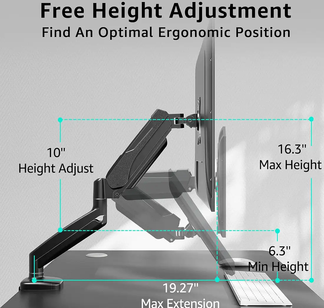 قلب تپنده Redragon GMK914، بازوی فنر گازی (Gas Spring) آن است. این تکنولوژی پیشرفته به شما این امکان را میدهد که مانیتور سنگین خود را تنها با یک لمس سبک، در هر ارتفاعی که میخواهید، ثابت کنید. با قابلیت تنظیم ارتفاع تا 41.4 سانتیمتر و حداکثر طول بازوی 49 سانتیمتر، به راحتی میتوانید مانیتور را به چشم خود نزدیک کرده یا برای حالت ایستاده، آن را بالا ببرید. این سیستم روان و دقیق، تنظیمات مکرر را بدون نیاز به آچار یا نیروی زیاد امکانپذیر میسازد، که یک مزیت بزرگ برای ارگونومی و کاربر پسند بودن است.