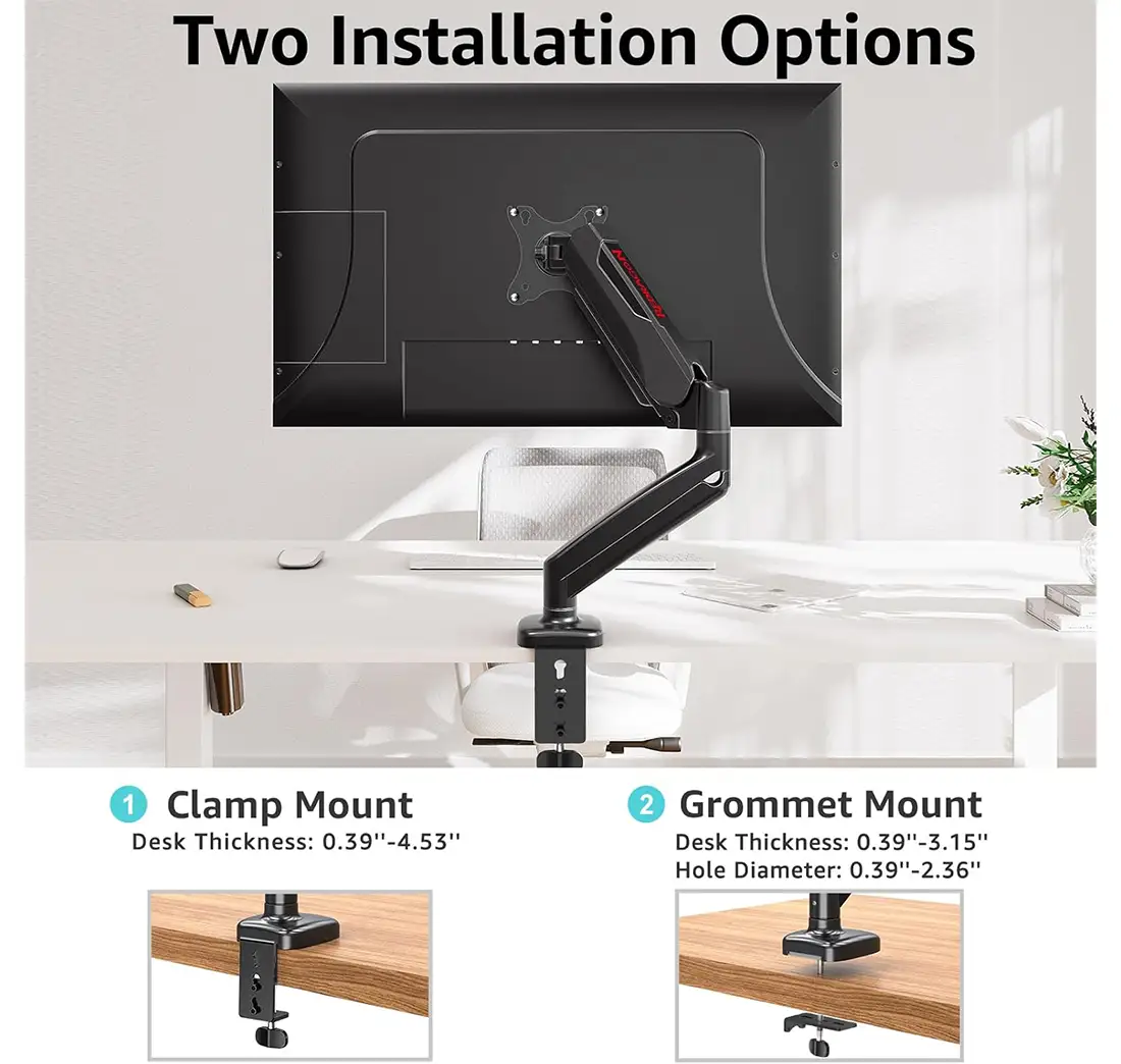 • C-Clamp: مناسب برای میزهایی با ضخامت 0.39 تا 4.53 اینچ (10 تا 115 میلیمتر). این روش نصب، سریع و آسان بوده و به حفاری میز نیازی ندارد.