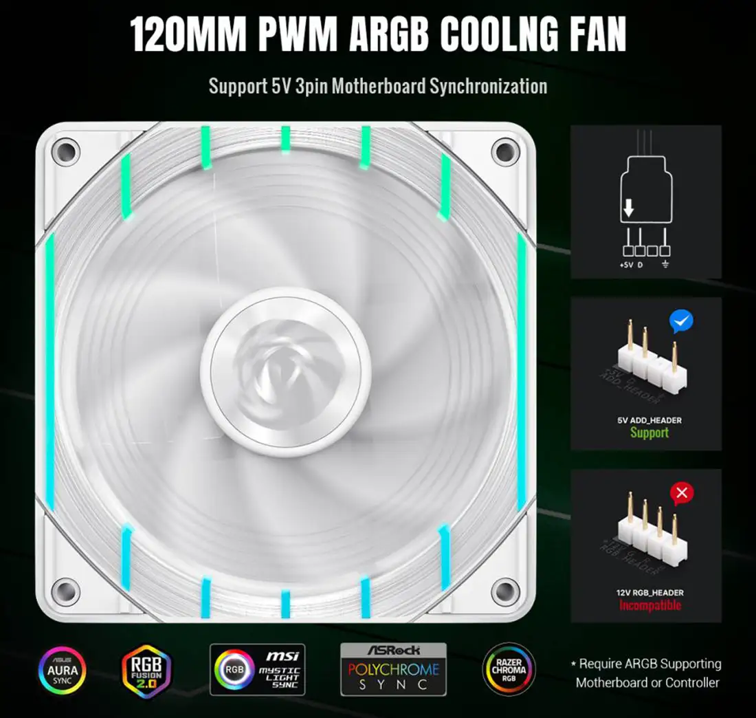 فن گیم مکس Tornado T12 فراتر از یک ابزار خنککننده است؛ یک عنصر زیباییشناختی برای سیستم شماست. مجهز بودن به 24 عدد LED با قابلیت ARGB به این معناست که هر LED میتواند به صورت جداگانه کنترل شود. این قابلیت، امکان شخصیسازی میلیونها رنگ و افکتهای نوری پیچیده و پویا را فراهم میکند. رنگ سفید فن، در ترکیب با نورپردازی ARGB، کنتراست فوقالعادهای ایجاد کرده و جلوهای خیرهکننده به داخل کیس میبخشد. این فن به راحتی با نرمافزارهای نورپردازی مادربردهای اصلی مانند ASUS Aura Sync، MSI Mystic Light و Gigabyte RGB Fusion همگامسازی میشود.