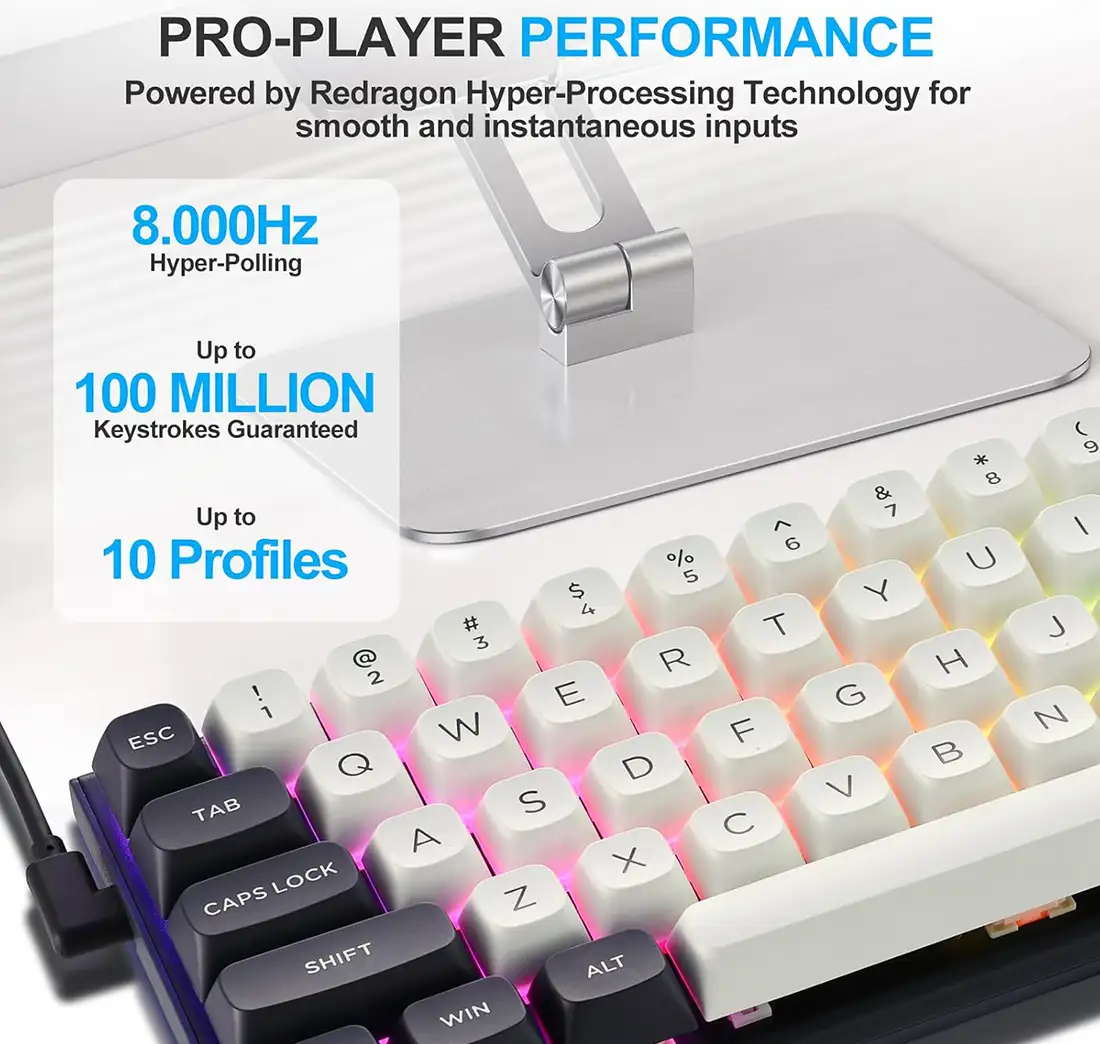 کیبورد گیمینگ ردراگون K712 RGB-M، نمادی از سرعت و تکنولوژی مدرن در ابعادی فشرده است که برای گیمرهای حرفهای و عاشقان سرعت طراحی شده است. این کیبورد مکانیکال با بهرهگیری از سوئیچهای مگنتی (Magnetic) و نرخ بازیابی فوقالعاده 8000 Hz، مرزهای واکنشگرایی را جابجا کرده و تاخیر ورودی را به حداقل ممکن رسانده است. طراحی خیرهکننده با ترکیب رنگی سفید و مشکی و سایز 60%، این محصول را به انتخابی ایدهآل برای میزهای گیمینگ مینیمال تبدیل کرده که با داشتن 68 کلید، تمامی نیازهای اصلی کاربر را پوشش میدهد. اتصال این کیبورد از طریق درگاه USB-C با قابلیت جداسازی کابل 1800 میلیمتری انجام میشود که پایداری و سهولت در حملونقل را تضمین میکند. با برخورداری از نورپردازی RGB تمامعیار، قابلیت Anti-Ghosting، کلیدهای ماکرو و پشتیبانی از نرمافزار اختصاصی، K712 RGB-M سلاحی مخفی برای پیروزی در رقابتهای سرنوشتساز است.
