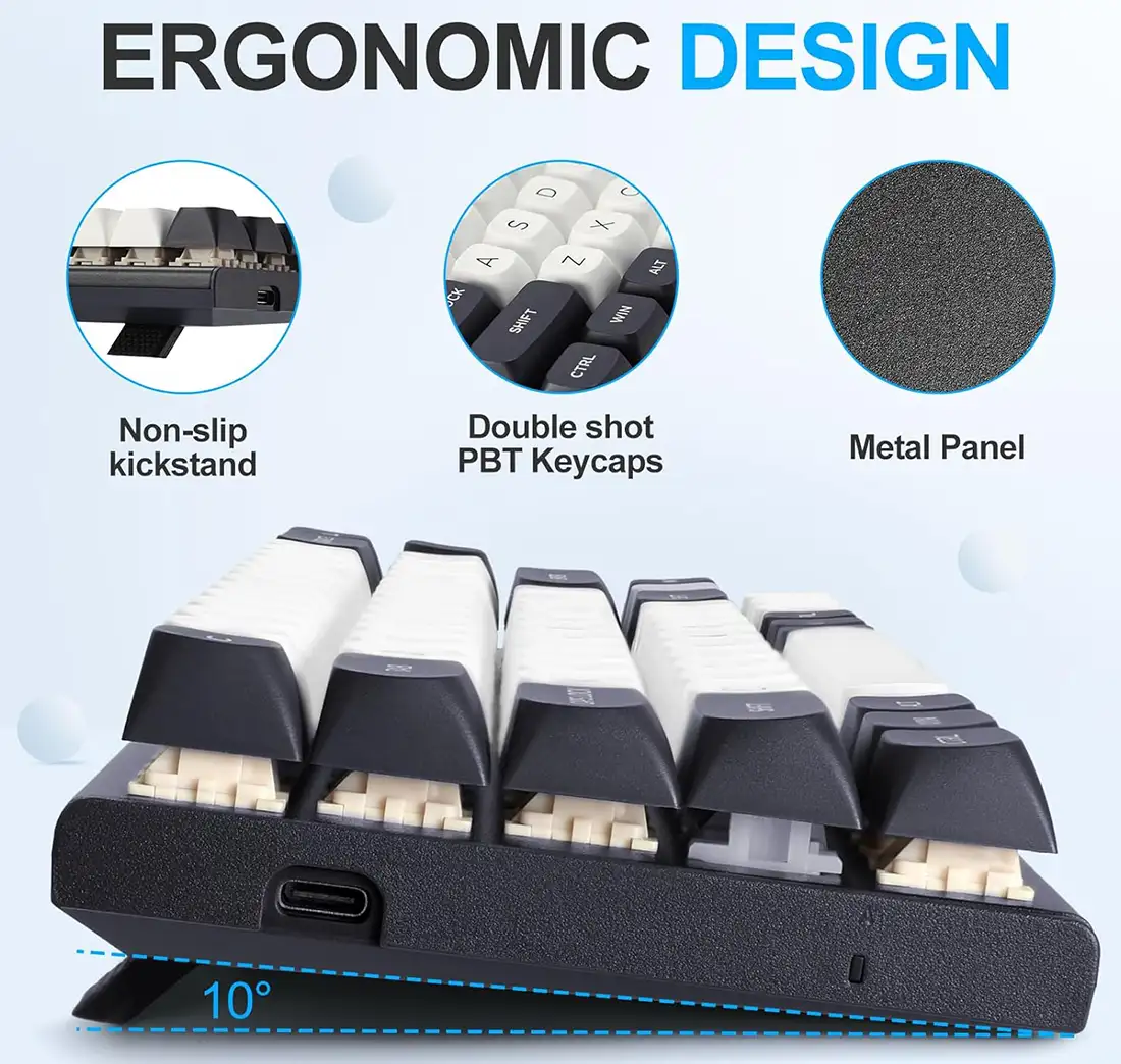 علیرغم ابعاد کوچک، کیبورد K712 از استحکام بالایی برخوردار است. استفاده از پلاستیک فشرده و تقویتشده در بدنه، باعث شده تا کیبورد در برابر ضربات و لرزشها مقاوم باشد. کلیدها دارای ارگونومی مناسبی هستند که به خوبی با فرم انگشتان سازگار شده و از خستگی زودرس در تایپهای طولانی یا جلسات گیمینگ شبانه جلوگیری میکنند. اگرچه این مدل فاقد صفحه استراحت مچ است، اما ارتفاع کم و شیب استاندارد آن باعث میشود مچ دست در وضعیت سالمی قرار بگیرد. پایههای ضدلغزش زیر کیبورد نیز از جابجایی ناخواسته آن روی سطوح صیقلی جلوگیری میکنند.