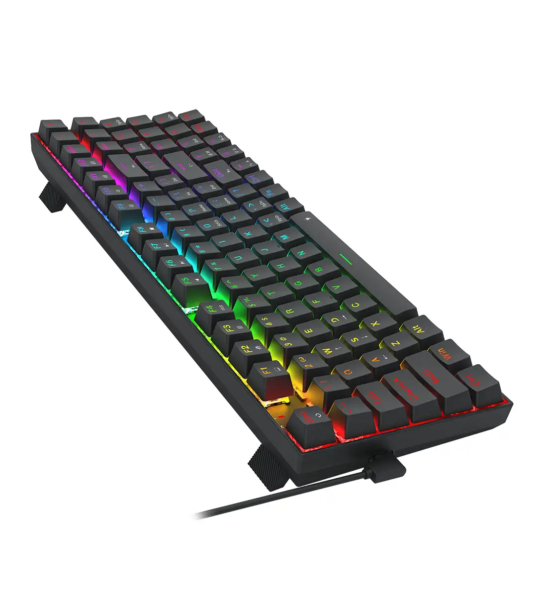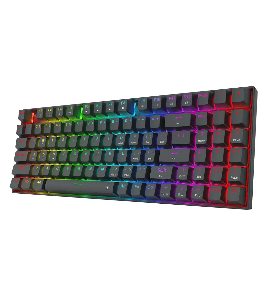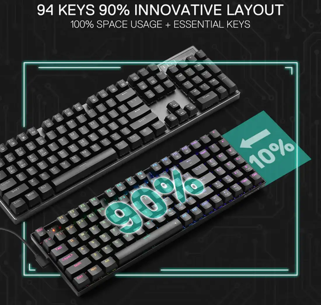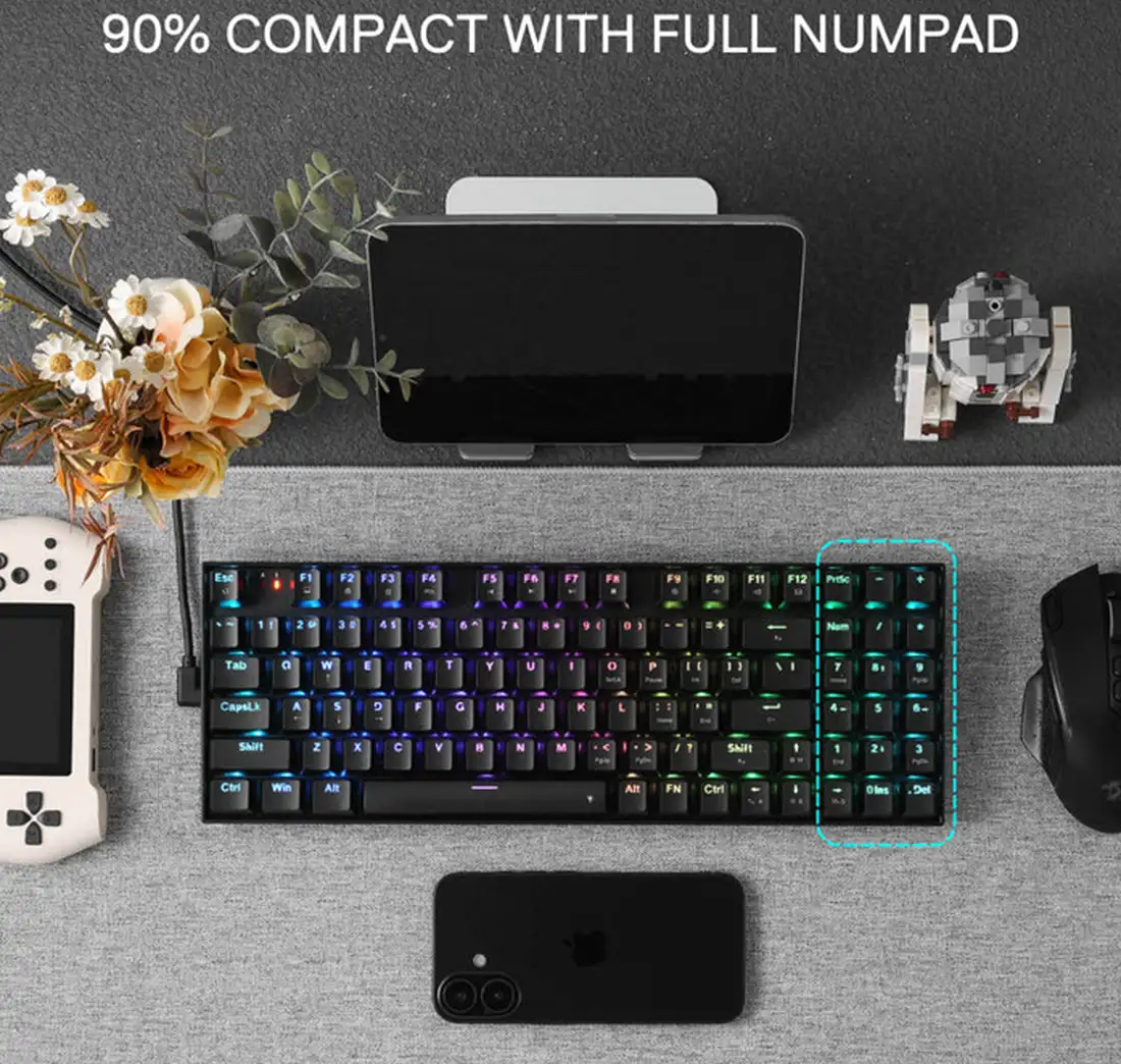 ردراگون در طراحی K735 از سایز 90% استفاده کرده است که یکی از محبوبترین ابعاد در سالهای اخیر محسوب میشود. این کیبورد با داشتن 94 کلید، بخش اعداد یا همان Numpad را حفظ کرده است، در حالی که با حذف فضاهای مرده و بهینهسازی چیدمان، ابعاد بسیار کوچکتری نسبت به کیبوردهای کامل (Full-size) دارد. این طراحی به شما اجازه میدهد تا هم برای محاسبات و کارهای روزمره از بخش اعداد استفاده کنید و هم فضای کافی بر روی میز برای حرکت آزادانه موس در هنگام بازی داشته باشید. این تعادل میان ابعاد و امکانات، K735 را به یک ابزار چندمنظوره تبدیل کرده است.