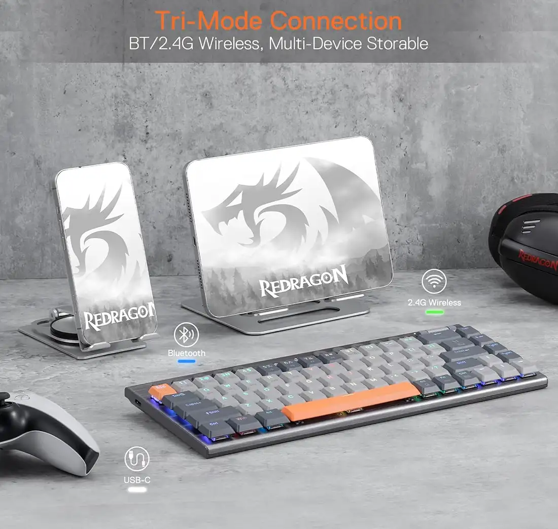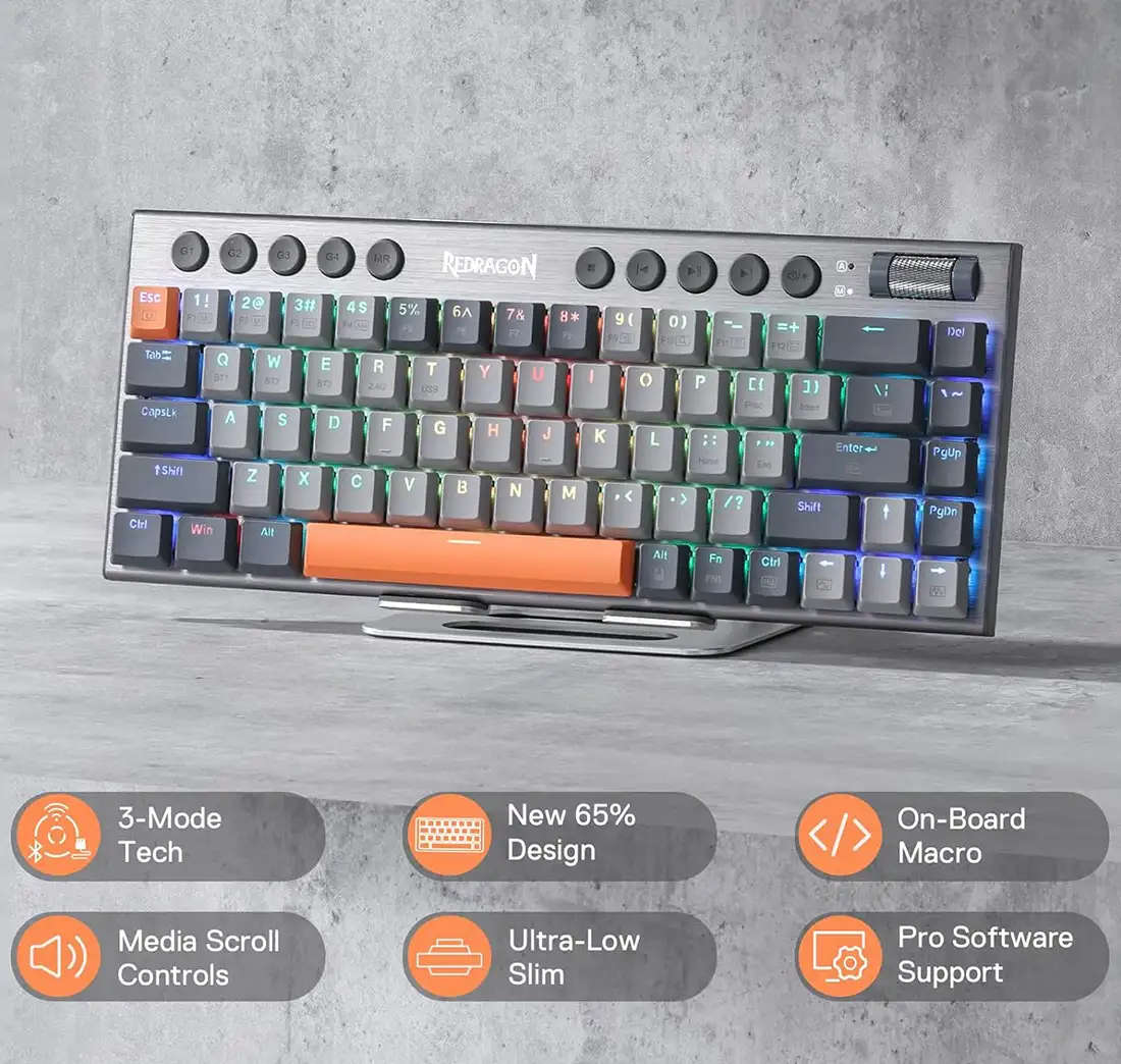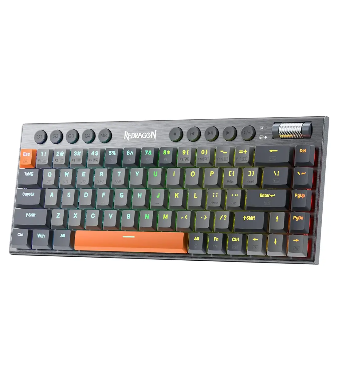 کیبورد مکانیکال گیمینگ ردراگون HORUS K609 GG Pro، یک شاهکار مهندسی در دنیای تجهیزات جانبی است که با ترکیب رنگی جسورانه طوسی و نارنجی، روح تازهای به ستاپ گیمینگ شما میبخشد. این کیبورد با سایز 65% و دارا بودن 84 کلید، انتخابی ایدهآل برای گیمرهایی است که به دنبال حداکثر کارایی در کمترین فضای ممکن هستند. ویژگی برجسته این مدل، اتصال سهگانه آن است که شامل بلوتوث، دانگل USB (2.4GHz) و اتصال باسیم از طریق پورت USB با کابل جداشونده 1800 میلیمتری میشود. بهرهگیری از سوئیچهای قرمز مکانیکال با عملکرد خطی و نرم، در کنار نورپردازی RGB قابل تنظیم و رول کنترل صدا، تجربهای بینظیر از سرعت و دقت را فراهم میکند. این محصول با برخورداری از باتری داخلی قدرتمند، قابلیت Anti-Ghosting، کلیدهای ماکرو و مدیا و پشتیبانی از نرمافزار اختصاصی، تمام ابزارهای لازم برای پیروزی در میدان نبرد را در اختیار شما قرار میدهد.