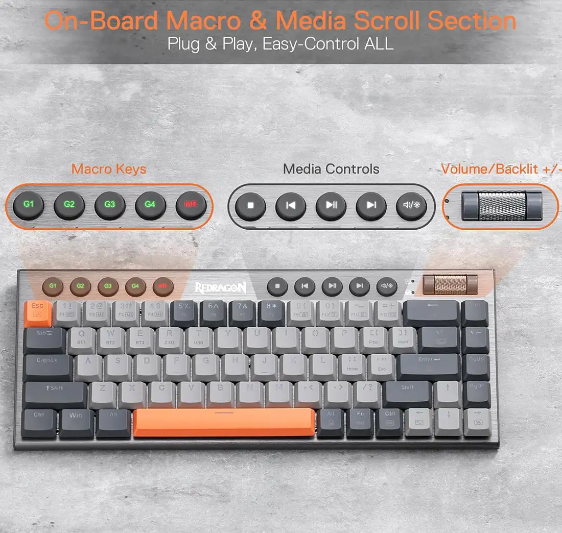 یکی از ویژگیهای کمیاب در کیبوردهای سایز کوچک، وجود کنترلر اختصاصی برای صداست. ردراگون در مدل Horus K609، یک رولر (Roller) فلزی باکیفیت را در گوشه کیبورد تعبیه کرده است. با استفاده از این رولر، شما میتوانید بدون خروج از محیط بازی یا استفاده از کلیدهای ترکیبی پیچیده، میزان صدا را در لحظه کم یا زیاد کنید. این دسترسی سریع به پارامترهای صوتی، تمرکز شما را بر روی بازی حفظ کرده و راحتی کاربری را به طرز چشمگیری افزایش میدهد.
